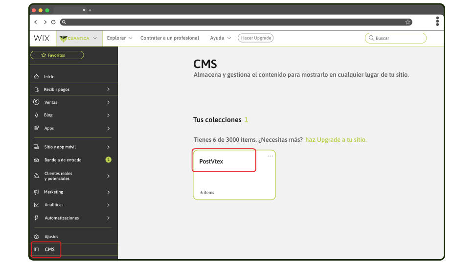 - Dentro del panel de Wix, deberá seleccionar la opción CMS y en la misma, deberá seleccionar la opción PostsVtex.