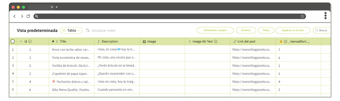 En esta opción, encontrará una tabla donde podrá agregar la información de las entradas existentes en el blog (es decir que todos los campos se tomarán de las publicaciones creadas previamente en Wix). Para cada una de ellas, deberá completar: