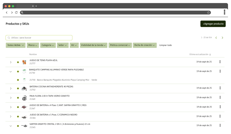 El catálogo en VTEX es la base de toda la operación de eCommerce, ya que concentra la información de los productos disponibles en la tienda online. Desde aquí, el usuario de negocio puede administrar la información, realizar búsquedas, aplicar filtros, crear y modificar productos, garantizando que los datos estén siempre actualizados y normalizados.