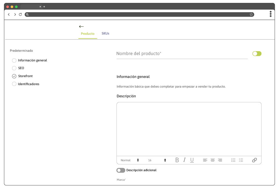 - Al seleccionarlo, se accede al formulario para la creación de un nuevo producto.