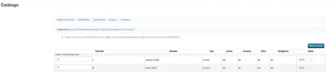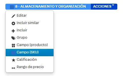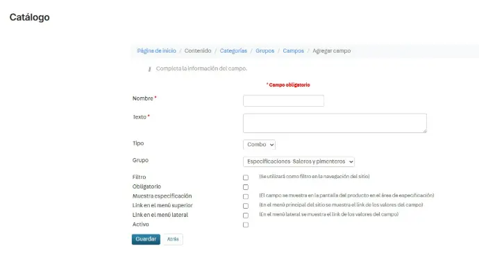 Una vez creada la categoría, es necesario definir sus características (también llamadas especificaciones o campos SKU), ya que estas serán utilizadas posteriormente por los productos para definir sus variantes (por ejemplo: color, tamaño, material, etc.).