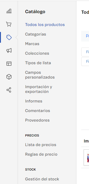 El menú catálogo permite realizar la gestión de todos los componentes que pertenecen al mismo. Dentro de dichas opciones, podrá encontrar: Todos los productos, Categorías, Colecciones y Gestión del Stock entre los más importantes.