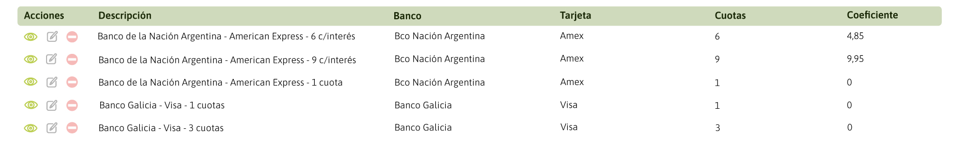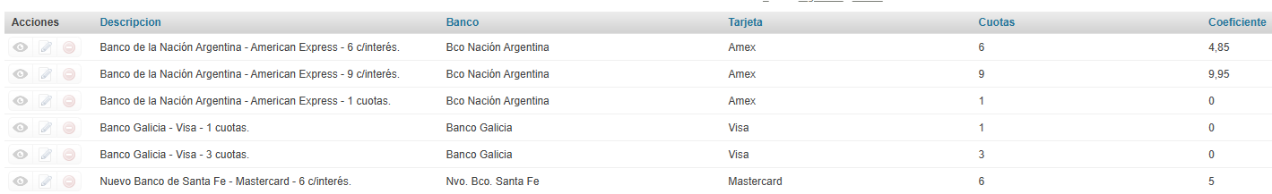 - Coeficiente: en este campo el usuario de negocio podrá indicar el % de interés del plan. Si el plan definido no tiene % de coeficiente de interés, la descripción del plan en la PDP y PLP será x cuotas s/int; e el caso de que el campo coeficiente tenga un valor superior o igual a 1, la descripción del plan de pago será x cuotas c/int.