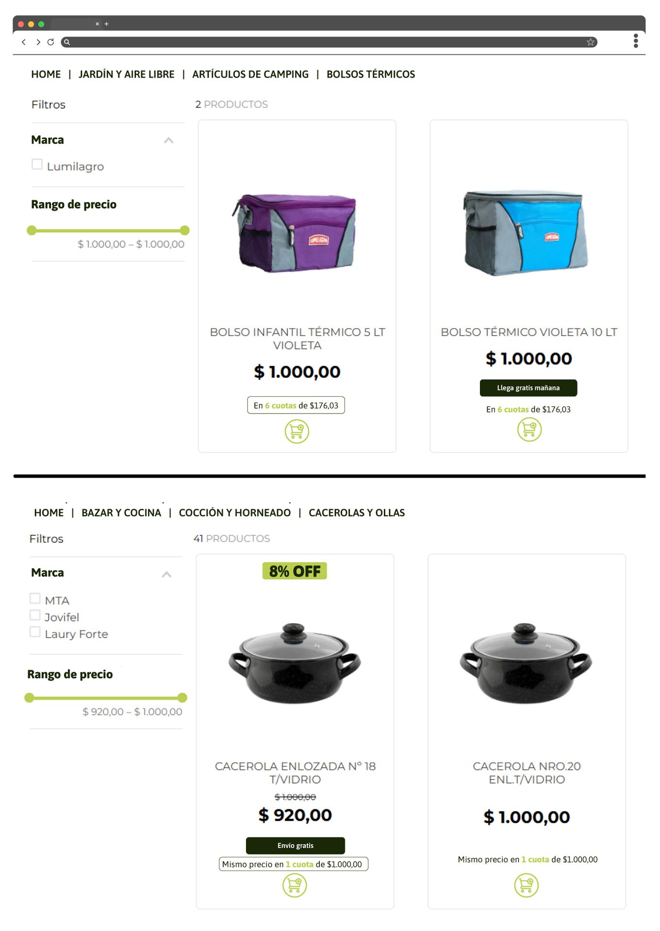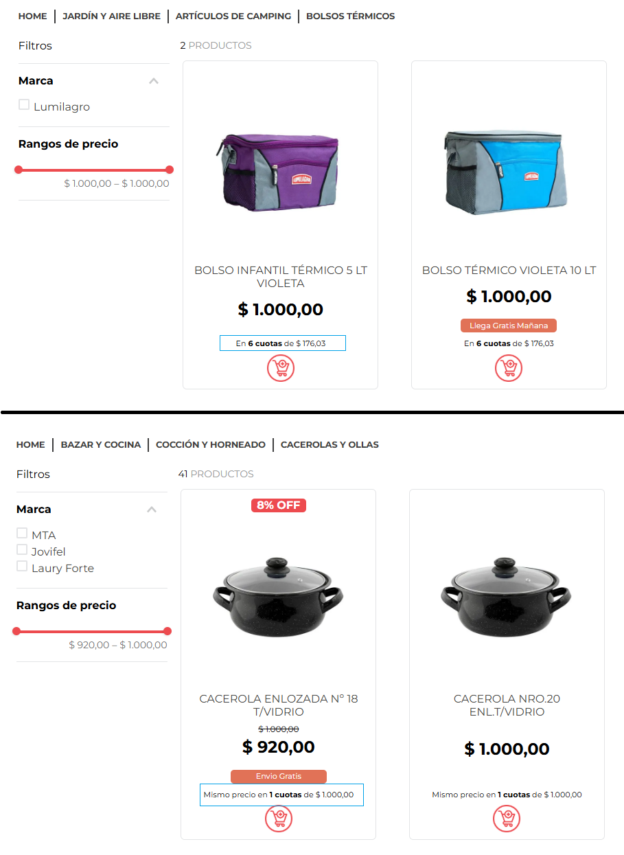 - Si el plan seleccionado no tiene interés, la cinta que se mostrará en la PLP y carruseles de producto será: Mismo precio en x cuotas de $z.