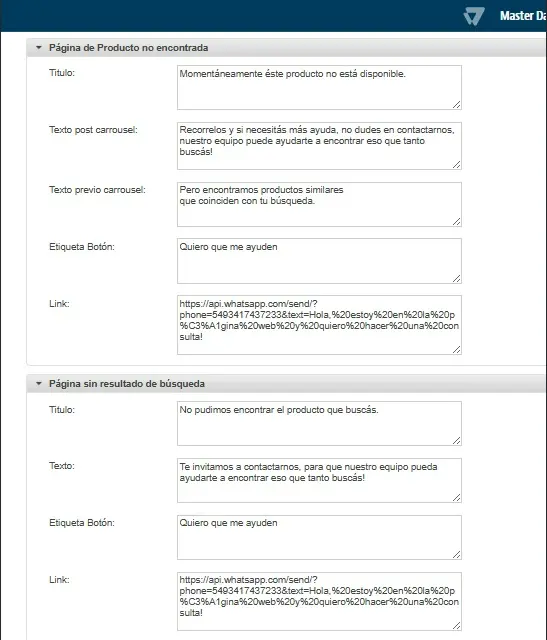 La configuración de estos mensajes se realiza desde Master Data, a través de un formulario específico que permite modificar el contenido mostrado en estas páginas.