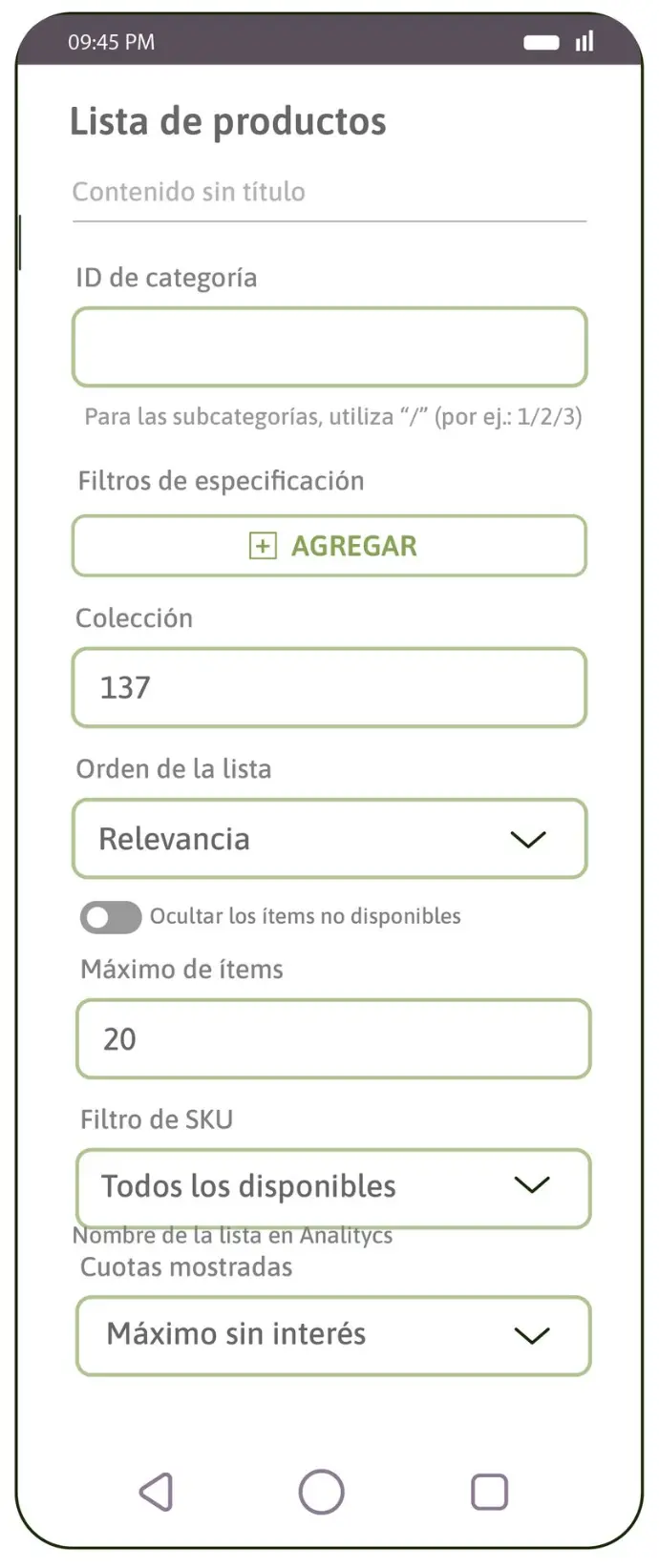 1. Id de Categoria: En este campo el usuario de negocio podrá indicar la categoria completa de productos que quiere que se muestren en el carrusel.
