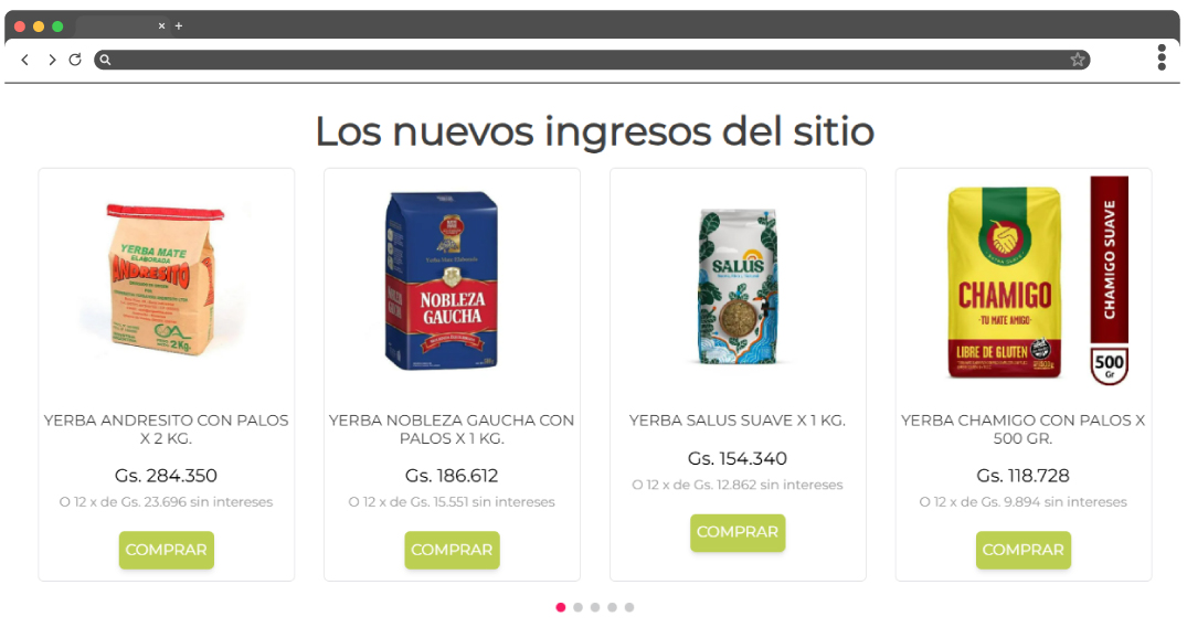 Carrusel clásico de productos con cabecera textual y navegación horizontal. Muestra hasta 4 productos por vista y permite navegación por páginas mediante indicadores inferiores.