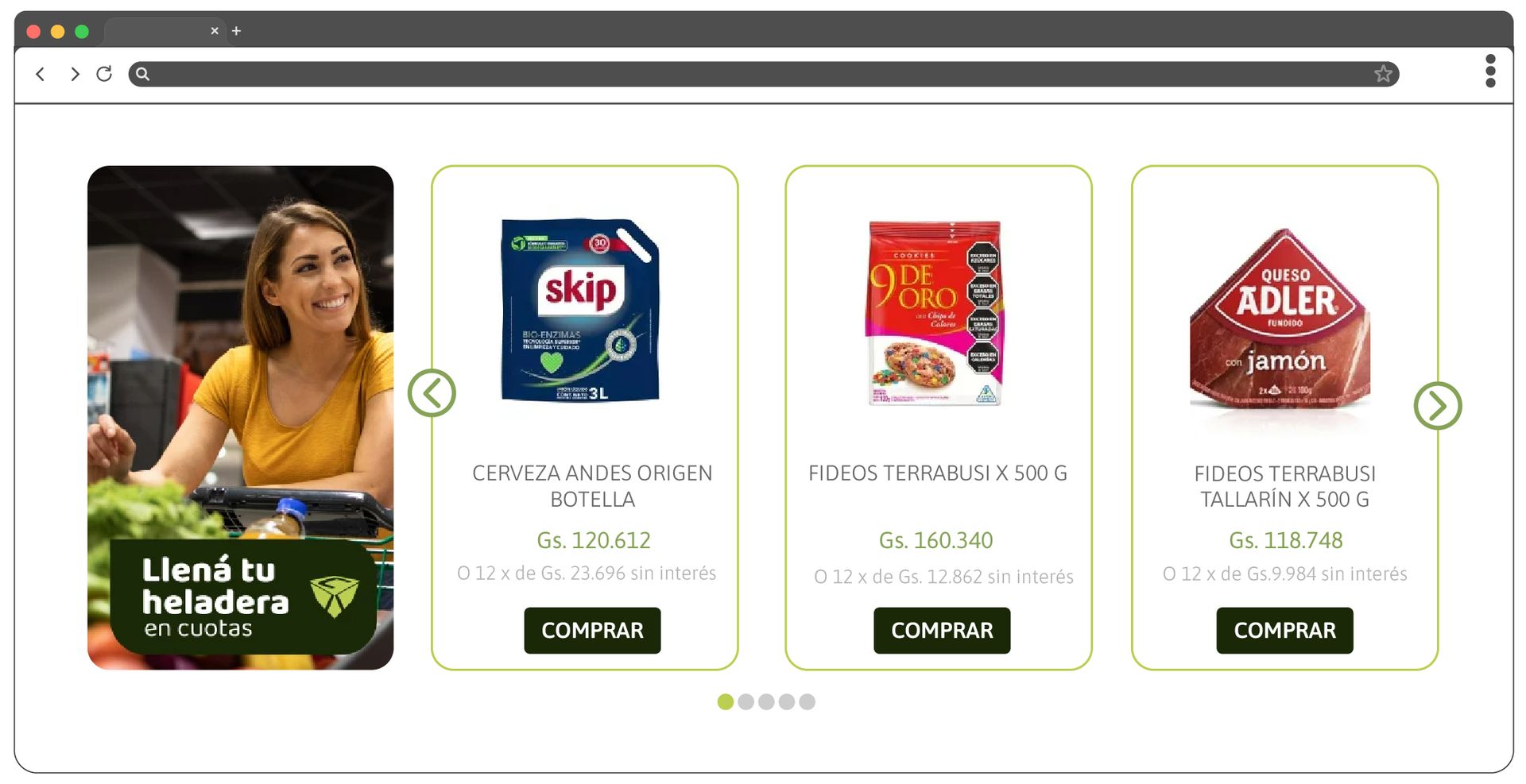 Esta versión del Carrusel de Productos, permite integrar ambientaciones visuales con productos relacionados, ideal para campañas específicas o promociones cruzadas.