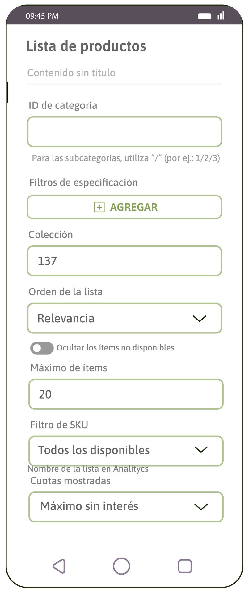 • Orden de la lista: Con este campo, el usuario de negocio puede indicar el orden de visualización de los productos de la categoría y/o colección de productos que se mostrarán.