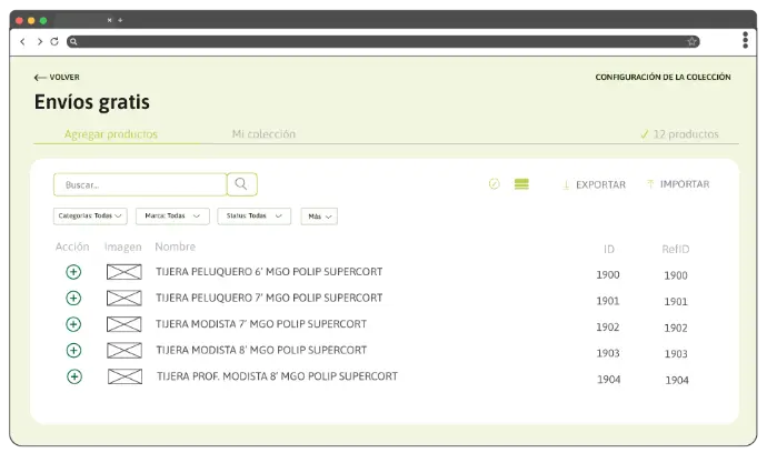 - Seleccionar los productos que desea que se agreguen a la colección, mediante la selección del icono +