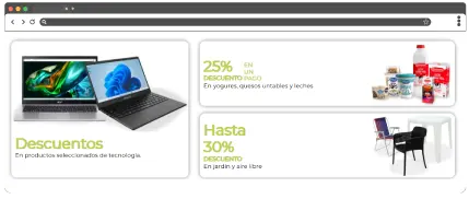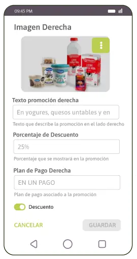 - Porcetaje descuento: Este campo se planteó inicialmente como un campo para indifcar el porcentaje de descuento de la promoción, pero puede utilizarse para mostrar el contenido que el usuario de negocio desee destacar.