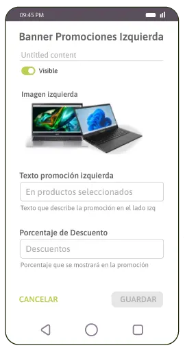 - Banner Promociones Izquierda: Al seleccionar esta opción, el usuario de negocio podrá configurar el banner izquierdo del componente, dentro del cual encontrará las siguientes opciones: