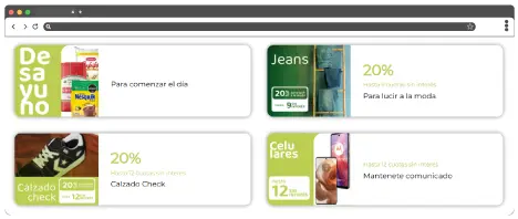 Este componente es ideal para sitios que tienen una oferta amplia o que desean comunicar múltiples beneficios simultáneamente, como cuotas, descuentos por categoría o productos destacados. Su estructura ordenada y visualmente clara favorece una navegación intuitiva del usuario.