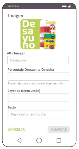 - Porcentaje Descuento: Este campo se planteó inicialmente como un campo para indifcar el porcentaje de descuento de la promoción, pero puede utilizarse para mostrar el contenido que el usuario de negocio desee destacar.