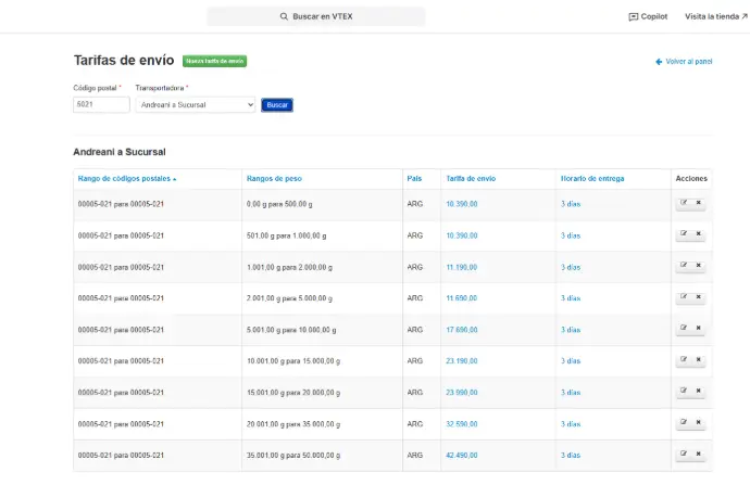 Las Tarifas de Envío representan los costos de entrega que la tienda ofrece a los clientes y están directamente vinculadas a las Políticas de Envío configuradas en VTEX. Cada tarifa indica cuánto costará realizar una entrega para un rango específico de código postal, peso y condiciones definidas por la transportadora.